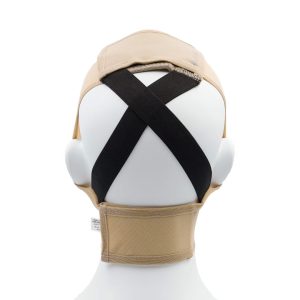 顔の脂肪吸引後の圧迫着「顎下・頬圧迫フェイスサポーター」は、頭頂部の生地の固定幅が広く、安定感のあるつけ心地が特徴です。両耳の下にゴムを配置したことで、従来品では難しかった顎下周辺の圧迫もしっかりサポートします。